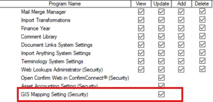 Each user who needs access to GIS 2-Way Integration mappings must have the appropriate permissions. After the tenant is enabled for GIS integration,any individual requiring access to the GIS service must have the(GIS Mapping setting)enabled under Confirm User security screen >>System Administration>>System configuration