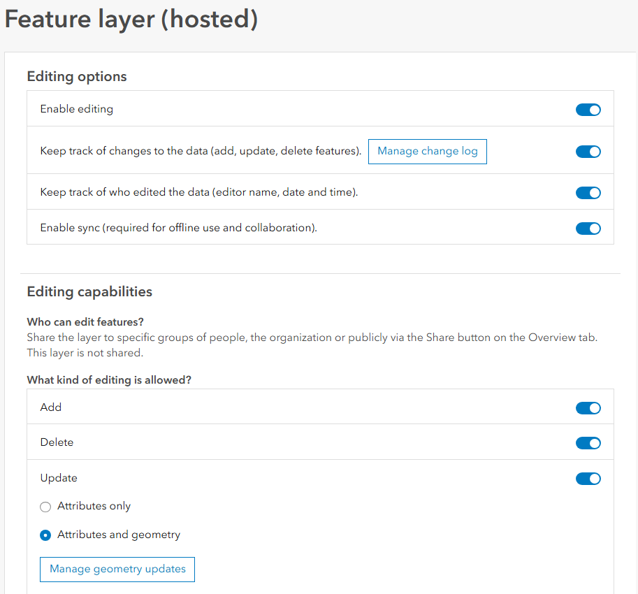 Any Layers to be configured for 2-way sync must be exposed as Feature Services, not just Mapping Services. The Feature Service must be configured to support Update and must support Global Ids. Global Ids are automatically added for layers that support Sync. The service must also record when each Feature was last updated so that we can just fetch changes. This is enabled with the "Keep track of who edited the data"option.