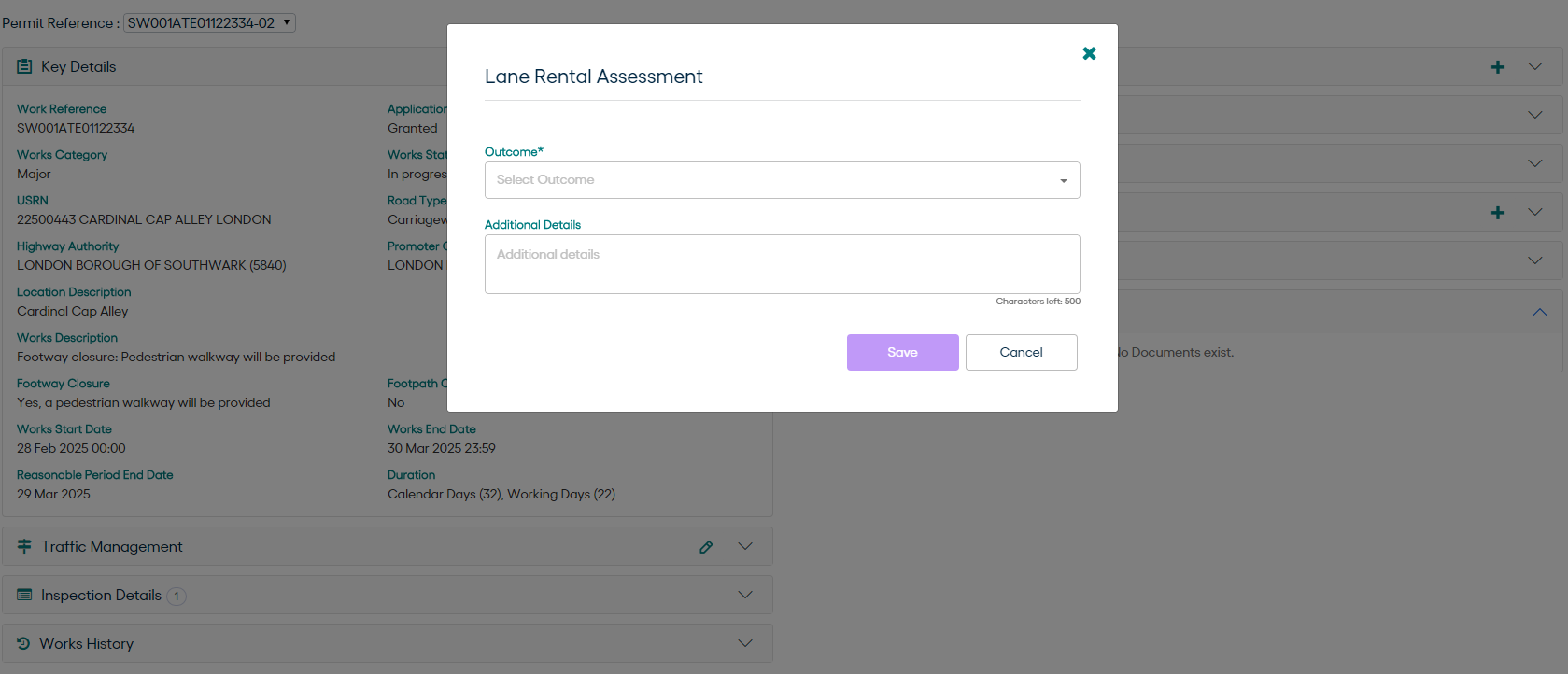 Lane Rental details contains 'Outcome' as mandatory and 'Additional Details' as optional field.