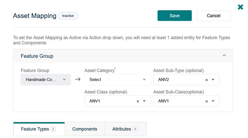 New Feature Group mappings can be created from the ‘Unmapped’ tab, or edits to existing mappings can be made from the ‘Inactive’ tab. Once selecting a Feature Group, the ‘Asset Mapping’ screen will be displayed.