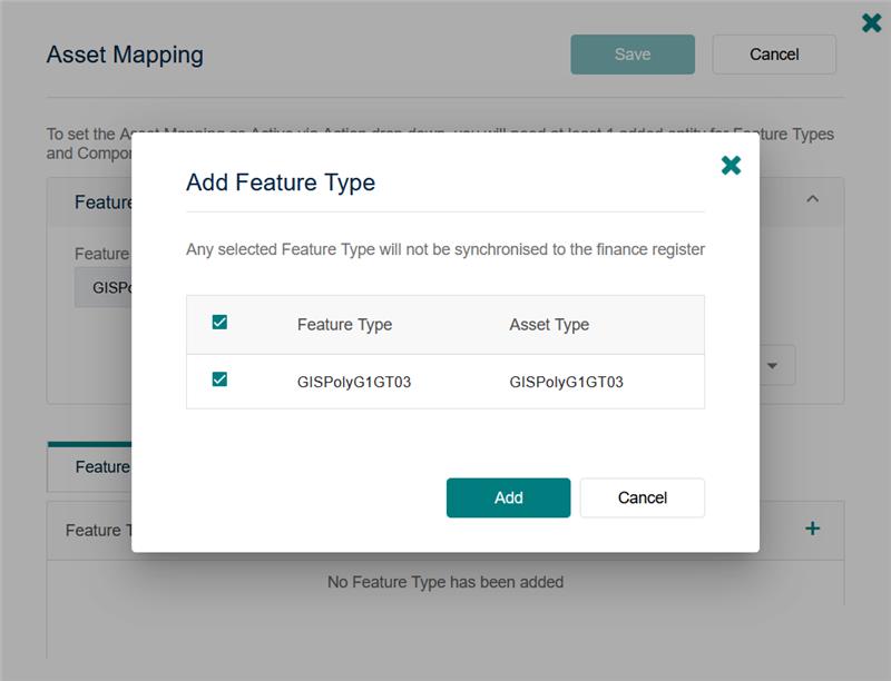 To support this requirement, the user will have the option to map which Confirm Feature Types within a mapped Feature Group will be created in Financial Asset Register. If selected, Feature Type value will be stored as Asset Type in Financial Asset Register.